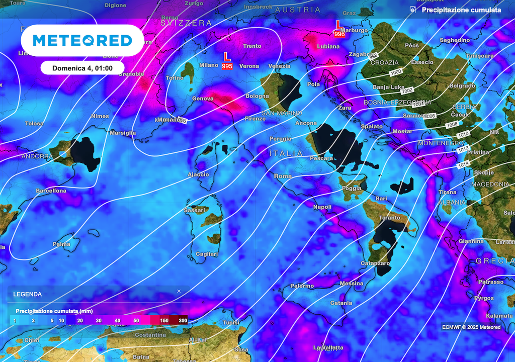 Domenica 4 gennaio perturbato ventoso, con effetti condizionati dall’orografia: piove al nord a ridosso delle Prealpi centro orientali, nevica sulle Alpi fra Lombardia orientale, Trentino Alto Adige e Friuli Venezia Giulia, fino a fondovalle. Piogge intense fra Liguria orientale, Emilia occidentale, alta Toscana e dorsale Appenninica settentrionale, temporaneo anomalo aumento termico nelle zone sottovento, con 15-16°C per esempio a Bologna.
