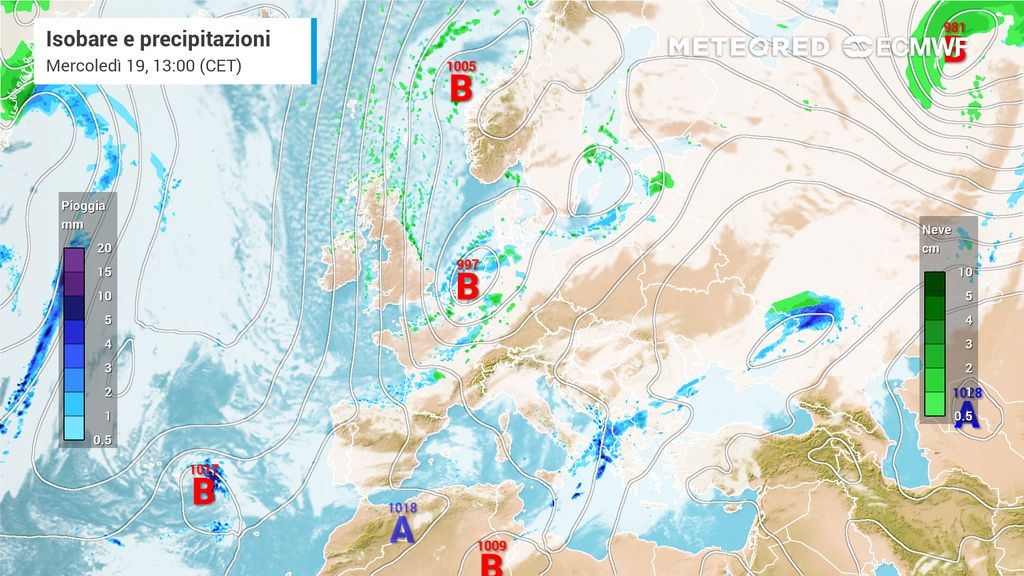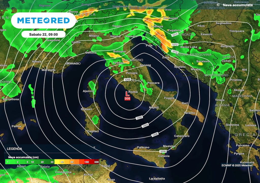 Sono dunque attese altre precipitazioni al Nord e in gran parte del Centro, più intense al Nordovest e versante tirrenico. Rapido abbassamento del limite delle nevicate fino a 600–400 m, localmente più in basso tra Piemonte e Lombardia occidentale. Scarse le possibilità di fiocchi in pianura, ancor meno di una imbiancata, anche se qualche scenario poco probabile non la esclude.