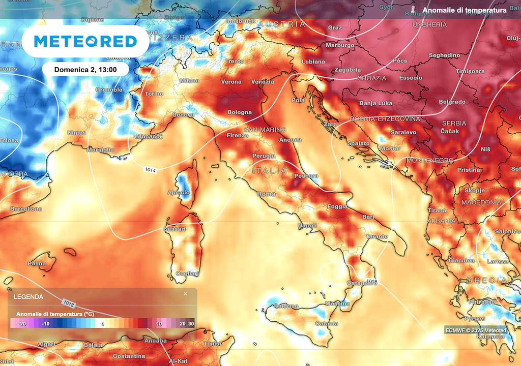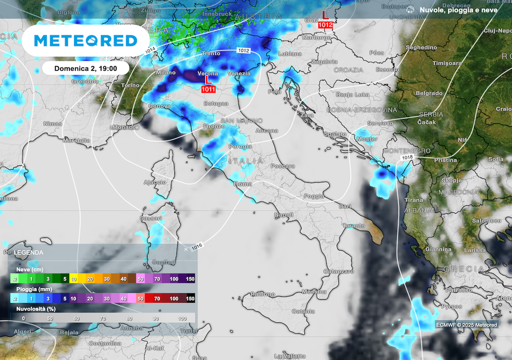 Sulle Alpi neve sopra a 1500-1800 m. Le zone del nord esposte ai venti di caduta da SW come Emilia Romagna centro orientale e in parte Veneto meridionale saranno spesso in “ombra pluviometrica”, con diradamenti seguiti da possibili improvvisi rovesci. Anche il nordovest estremo, il Piemonte, sarà velocemente sottovento con variabilità e mite.