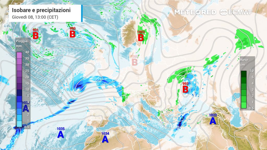 La complessa depressione mediterranea ha ricevuto come previsto alimentazione di aria fredda artica marittima tramite un’ondulazione inclinata da Scandinavia a Baleari della corrente a getto. Ora il minimo principale si è approfondito sul medio-basso Tirreno, nella classica configurazione da depressione Tirrenica nevosa per la pianura del nord e a bassa quota al centro settore Adriatico. Tuttavia questa fase sarà breve, il minimo si muoverà veloce verso l’Albania.