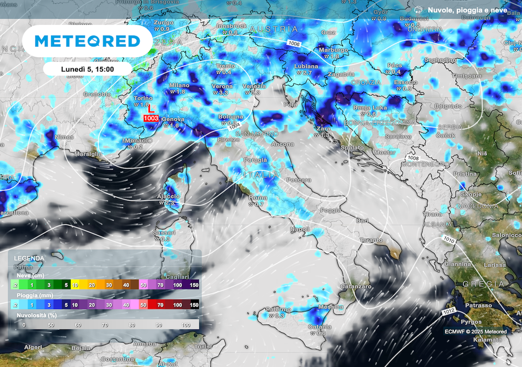 Lunedì e martedì tornano piogge e temporali al nord, dove si presenteranno a tratti con precipitazioni diffuse; maltempo temporalesco anche al centro, con temporali dal comportamento più irregolare, anche se in genere frequenti, lunedì su Toscana e Umbria, martedì anche sul Lazio e poi in movimento su Marche, Abruzzo e Molise. Variabile ventoso ma scarse precipitazioni in Sardegna.