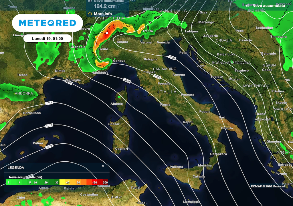Copiose nevicate interesseranno le Alpi, oltre i 1400-1600 m, con neve pesante e bagnata. Lunedì al nord perturbato con piogge diffuse in pianura e neve sulle Alpi, con primi cenni di calo quota neve a 600-800 m in alcune zone per una infiltrazione fredda leggera da est. Piogge prevalenti in Appennino.