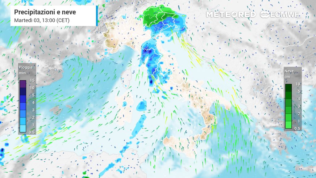 Piogge a tratti forti in Liguria e in alta Toscana, nevicate diffuse sulle Alpi occidentali. Nel pomeriggio le nevicate si estendono alle Alpi centrali e in parte di quelle orientali, e le precipitazioni piovose a quasi tutto il nord. In Appennino inizialmente nevica oltre i 1200 m, ma il limite neve si innalza.
