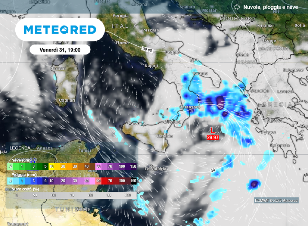 La perturbazione di origine atlantica che ha colpito nei giorni scorsi le regioni centro-settentrionali dell'Italia, si è mossa nelle ultime ore verso Sud-Est iniziando a coinvolgere anche la Sicilia; nel corso della notte l’area di bassa pressione è avanzata verso lo Ionio coinvolgendo la Calabria con precipitazioni a prevalente carattere temporalesco, più intense e persistente sul versante ionico della regione.