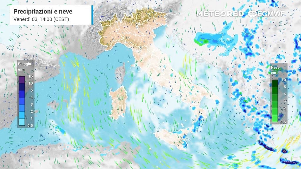 Mareggiate sono previste lungo le coste esposte; nevicate diffuse al di sopra dei 700-900 metri su Abruzzo e Molise, con apporti al suolo abbondanti, specie sui settori orientali.