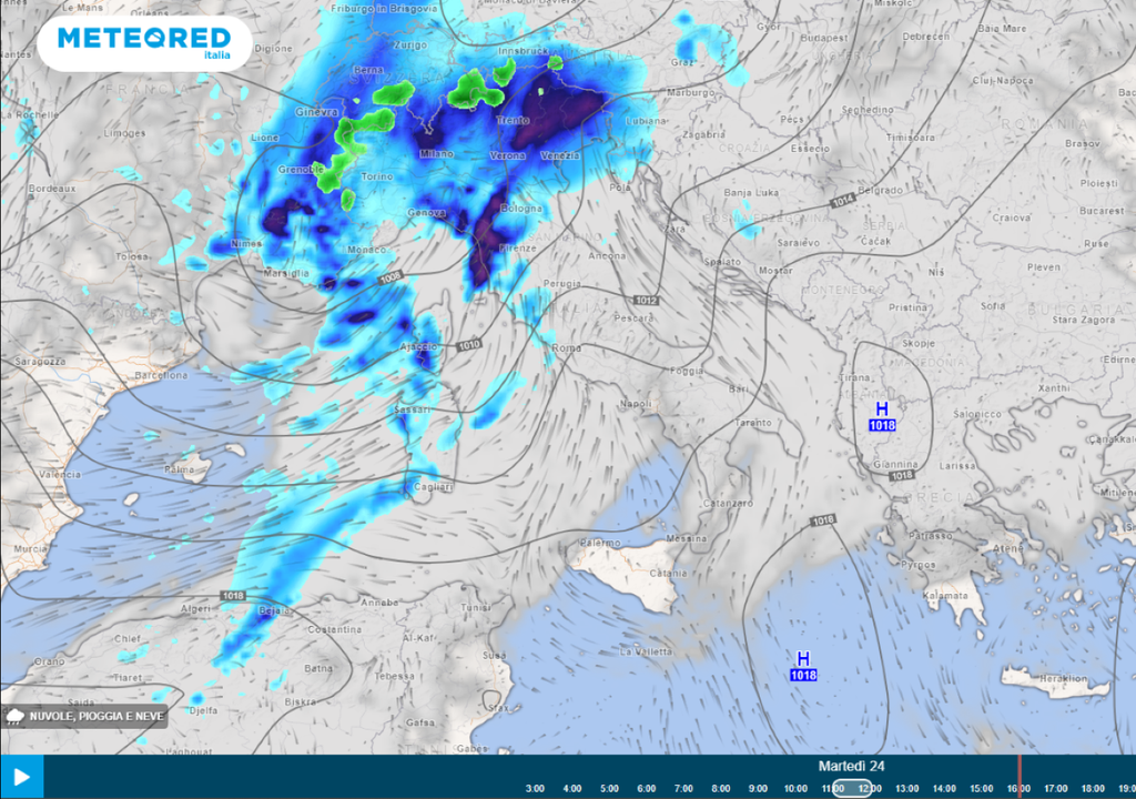 Ora l’area di maltempo si estenderà verso le regioni meridionali, fino ad ora rimaste escluse da questo peggioramento. Difatti, già nel corso della mattinata, la “warm conveyor belt” che interessa la Sicilia e il medio-basso Tirreno, a contatto con il fronte freddo nei bassi strati, in scivolamento verso la Calabria, potrebbe generare dei rovesci e delle celle temporalesche, in movimento verso la Campania, Basilicata e Calabria tirrenica.