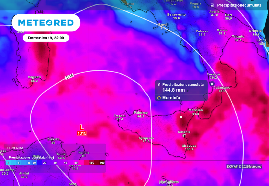 L’intensa ondata di maltempo che da venerdì andrà a interessare la Sicilia e la Calabria potrebbe rilevarsi veramente intensa. La risalita, dalle coste della Tripolitania, di una depressione mediterranea, carica di umidità, proveniente dalle basse latitudini africane, potrebbe anche produrre precipitazioni molto intense, con conseguenti disagi, per criticità di carattere idraulico e idrogeologico, specie nel caso di un passaggio più orientale della struttura ciclonica.