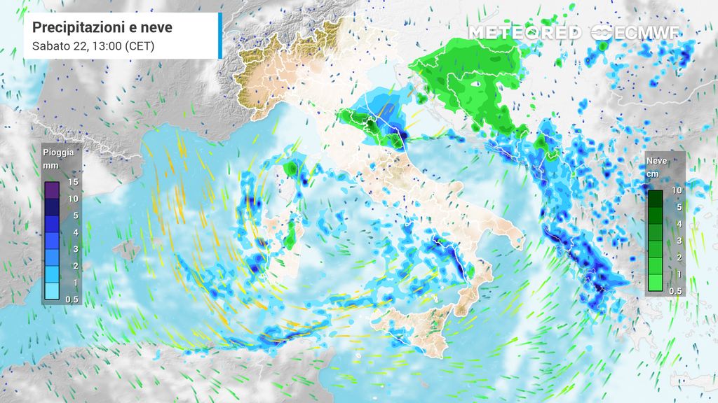 Il vortice inizierà ad apportare la prime piogge al Centro-Sud e sulle due Isole Maggiori, con le nevicate che continueranno a quote molto basse sulle Alpi. Dal pomeriggio, l'area di bassa pressione avrà raggiunto il Tirreno alimentando ulteriormente la fase instabile con nevicate sugli Appennini centrali oltre i 500-600 metri.
