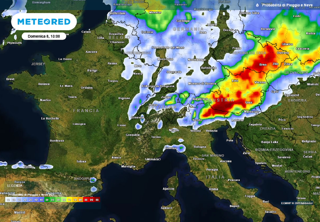 Stando ai nostri modelli di riferimento, basati sul modello europeo ECMWF, sarà un sabato con forti temporali nei Paesi del Centro Europa, dalla Svizzera all'Austria, ed anche nelle aree alpine più settentrionali di Piemonte e Lombardia.Possibilità di qualche piovasco anche sui rilievi della Liguria.