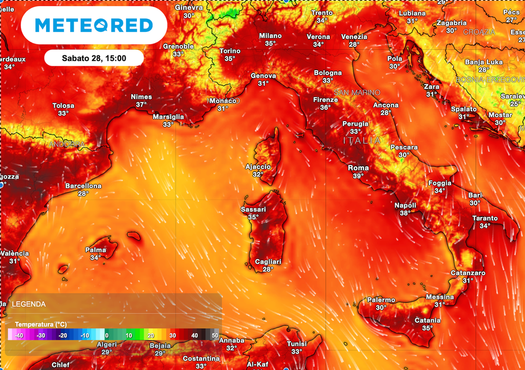 Fin dalle prime ore del mattino di sabato 28 giugno si prevede cielo sereno poco nuvoloso sull’Italia, grazie ad un robusto campo di alta pressione di matrice subtropicale che determinerà caldo intenso da Nord a Sud con i valori più elevati dapprima in Sardegna, dove già si sono toccati i 40 °C e poi anche su alcune regioni del Centro e al Sud.