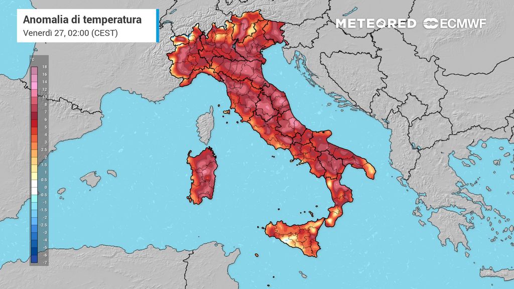 L’anomalia termica positiva sarà più marcata sui rilievi, dalle Alpi agli Appennini con valori che si porteranno al di sopra della media del periodo anche di 12 °C e oltre.