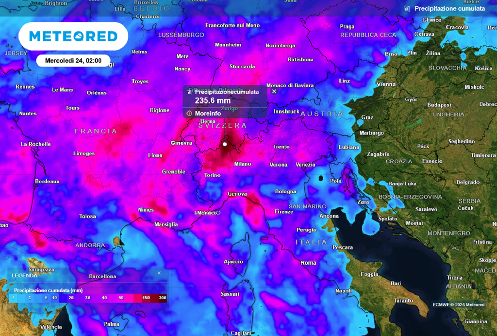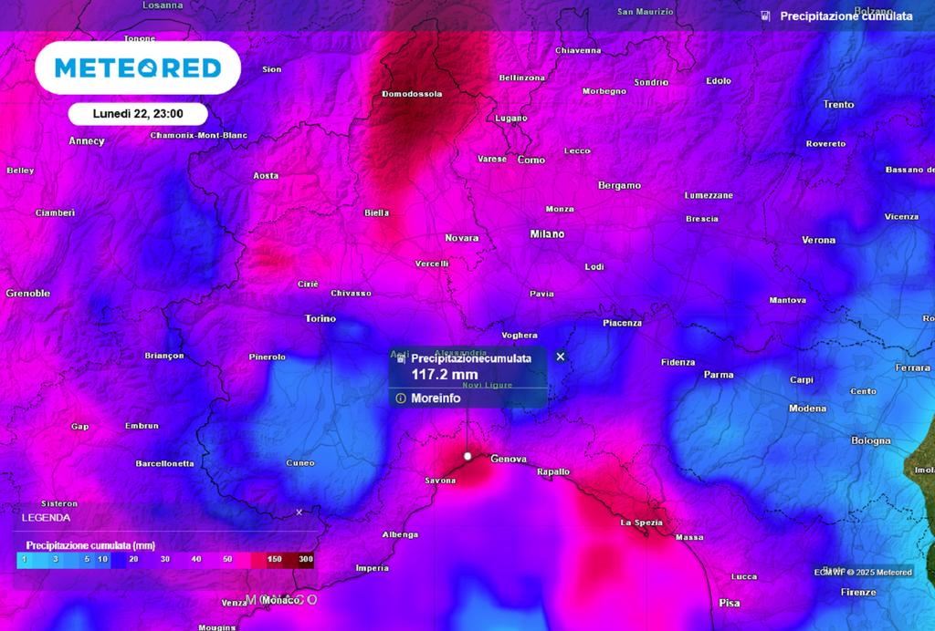 Alla fine della giornata di lunedì 22 settembre il modello di riferimento di Meteored indica possibili accumuli pluviometrici superiori ai 100 mm in Liguria e Piemonte.