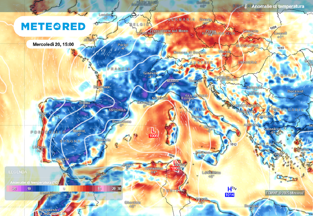 Da segnalare, oltre al maltempo, anche il calo termico in arrivo. Dopo un avvio di agosto segnato da una lunga ondata di calore, già abbiamo vissuto negli ultimi giorni un abbassamento delle temperature, ma tra mercoledì e giovedì il calo sarà più marcato e l'Italia si troverà quasi interamente con temperature più basse della media del periodo.