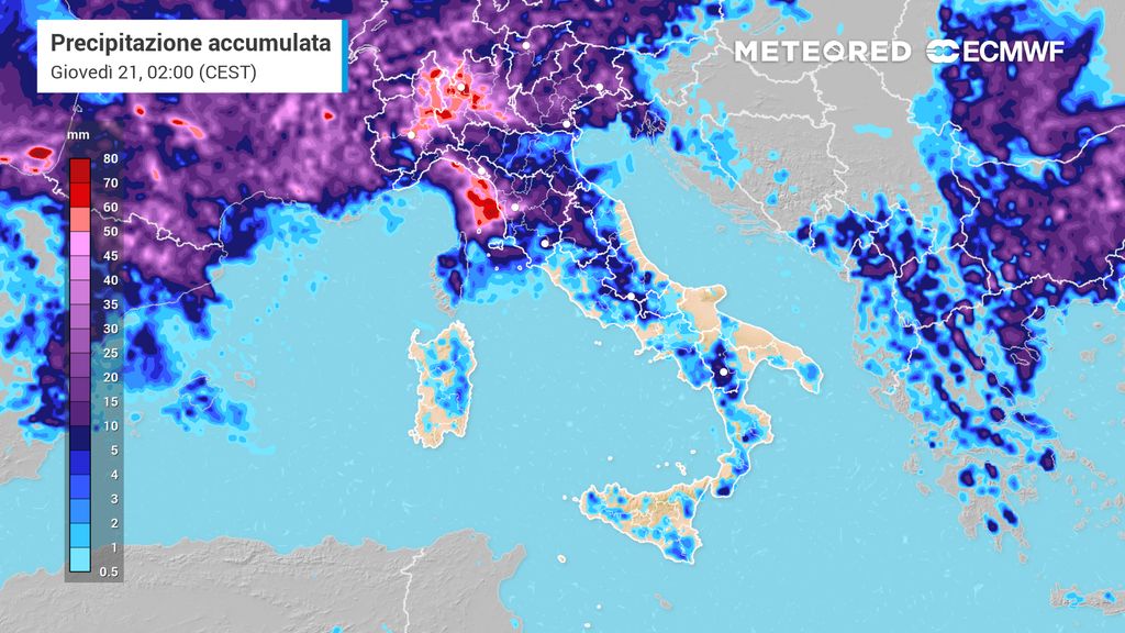Secondo il modello di riferimento di Meteored, cioè il modello europeo ECMWF, potrebbero verificarsi precipitazioni molto abbondanti al centro-nord. Le regioni più colpite saranno quattro: Toscana, Liguria, Lombardia e Friuli-Venezia Giulia.