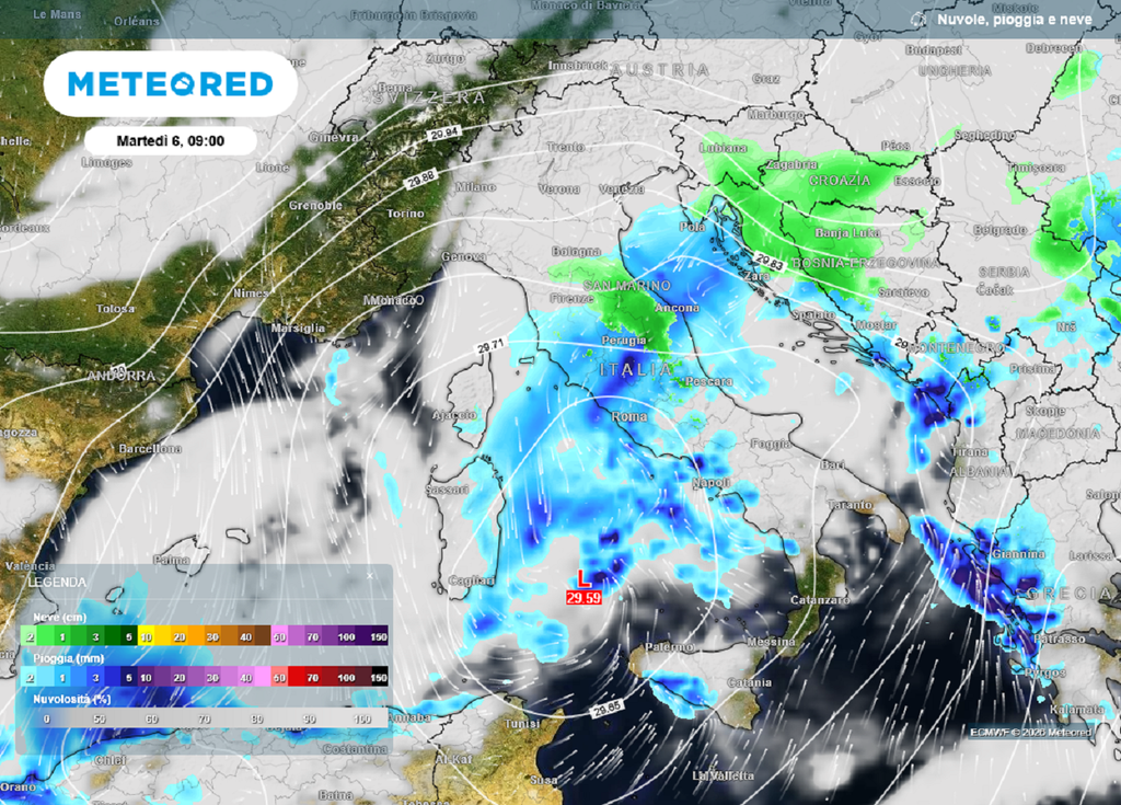 La mattina del 6 gennaio il Nord Italia resterà in parte ai margini delle precipitazioni, ma con temperature molto rigide, mentre al Centro sono attese piogge già dal mattino su Lazio, Marche e Abruzzo, con nevicate lungo l’Appennino centrale inizialmente oltre i 1400 metri.