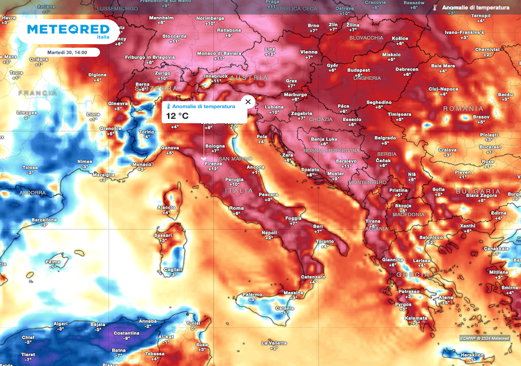 Più tiepido, in parte caldino al centro e al nordest: temperature massime verso i 23-25°C al nord, 26-28°C al centro, 24-26°C al sud.Poco probabili perà i 30°C, nel caso limitati a piccole zone della Sardegna.
