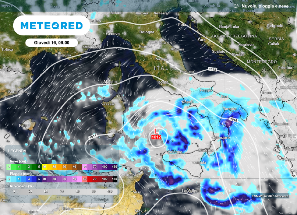 Successivamente, soprattutto a partire da domani, il maltempo si estenderà anche alla Sicilia e, con il progressivo spostamento del minimo di pressione verso il Tirreno, potrebbero essere coinvolte anche il Lazio e le zone interne del Centro, oltre ai versanti adriatici e al Sud peninsulare.