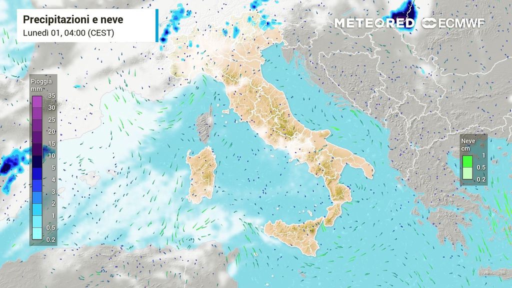 Le precipitazioni più intense, seppur sparse, si attendono sul versante adriatico, tra Romagna, Marche, Abruzzo, Molise e Puglia settentrionale, ma rovesci e brevi temporali sono previsti anche sui settori pianeggianti del Nord, sul resto dell'Emilia-Romagna e delle regioni centro-meridionali peninsulari.