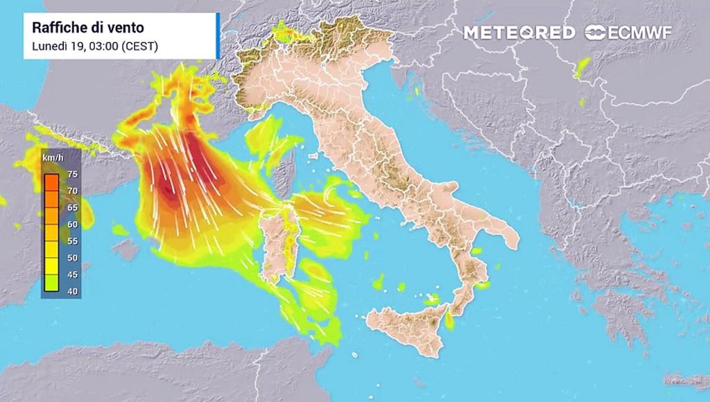 Un forte Maestrale con intensità massime intorno ai 70 km/h investe Sardegna e Sicilia, e i mari risultano generalmente molto mossi.