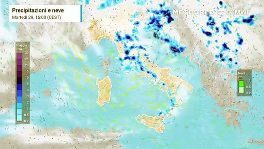 Al centro riprendono rovesci sulla Toscana tirrenica in mattinata, anche su levante Ligure, Lazio meridionale e Abruzzo nel pomeriggio. Ancora maestrale forte in Sardegna. Al sud variabilità con qualche rovescio nelle coste tirreniche, ventoso principalmente da ponente.