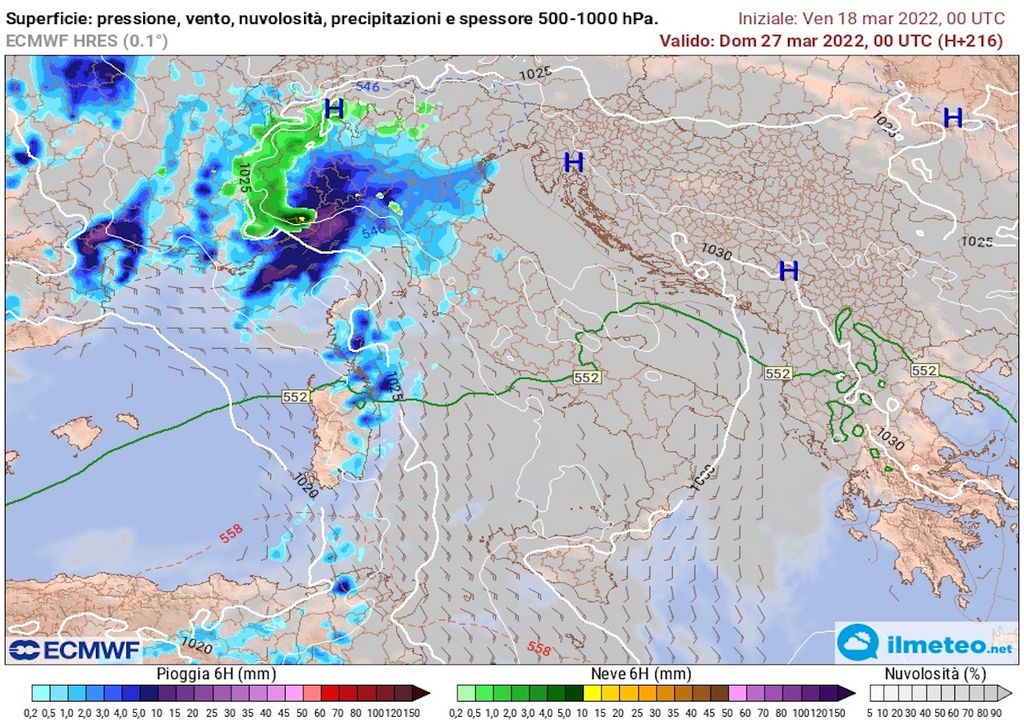 Il run odierno del modello ECMWF mostra una depressione mediterranea che si potrebbe collocare verso la Sardegna. Vi è dunque una speranza di alcune piogge al nord, con qualche nevicata sulle Alpi. Al momento non appaiano fenomeni organizzati ed intensi. La situazione è incerta e questo non appare uno sblocco delle vere perturbazioni atlantiche. Al centro sud il fine settimana vedrà sabato così così al centro, con qualche pioggia su Sardegna, Toscana e in parte Lazio e Umbria. Temperature in aumento, per riattivazione dello scirocco, con possibili nuovi trasporti di sabbia desertica.