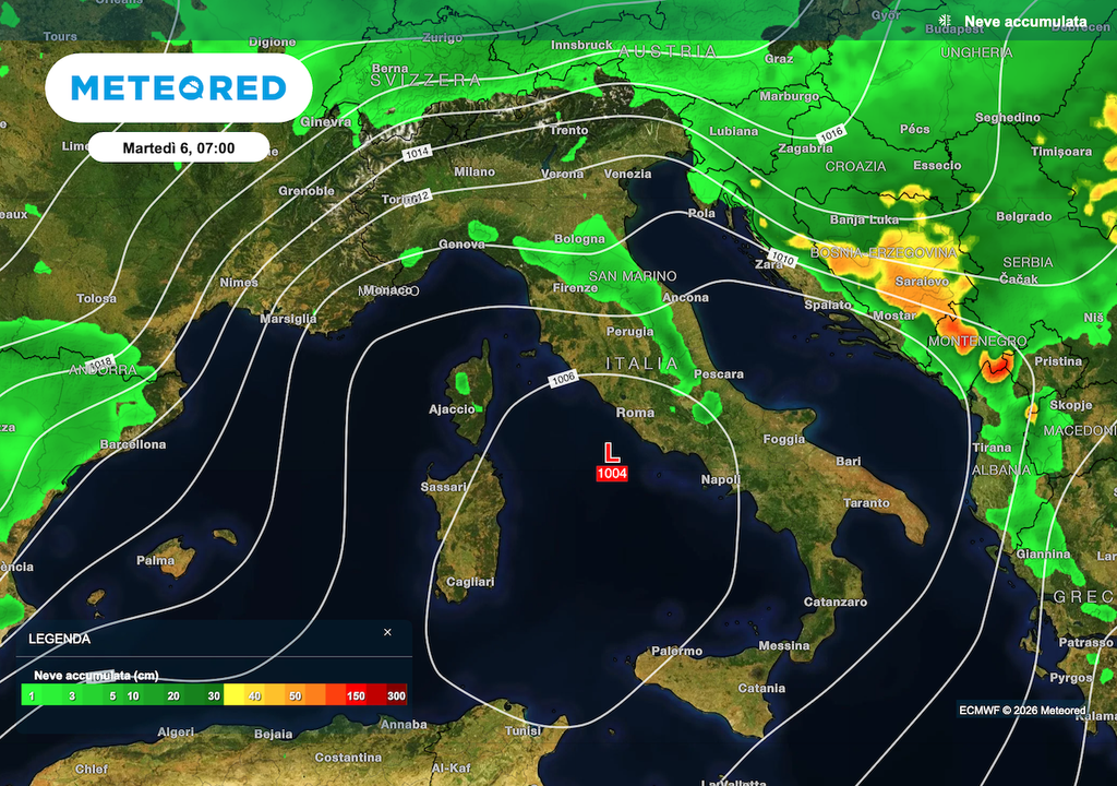 Lunedì 5 gennaio 2026 fase di pausa, le precipitazioni si attenuano e interessano in modo irregolare il centro, al nord nuvolosità irregolare, nel resto d’Italia del centro sud, molto nuvoloso con qualche diradamento locale temporaneo. Temperature in calo al nord, con gelate in nuova intensificazione. Freddo anche al centro, con gelate nelle conche, temporaneo richiamo mite al sud.