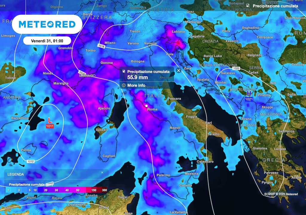 I temporali più forti riguarderanno in particolare la Liguria, ma una zona temporalesca si formerà anche nelle regioni tirreniche centrali, fra Toscana meridionale, Lazio inclusa Roma e marginalmente Campania.