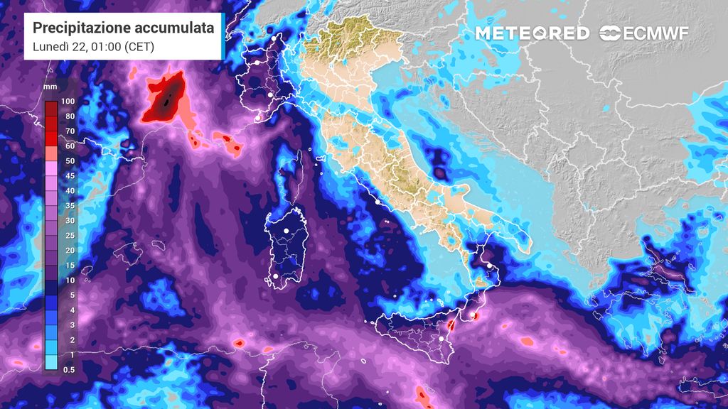 Si attendono piogge sparse che, localmente, potranno assumere anche carattere di rovescio o di temporale. Gli accumuli stimati dai modelli ad alta risoluzione per queste aree oscillano tra i 20 e i 30 mm nelle zone più esposte, con possibili picchi anche molto superiori in caso di fenomeni temporaleschi stazionari a ridosso dei rilievi (effetto stau su Etna e Aspromonte) che, tuttavia al momento, i dati degli ultimi aggiornamenti predittivi sembrano scongiurare precipitazioni molto intense inizialmente ipotizzate (100 mm).