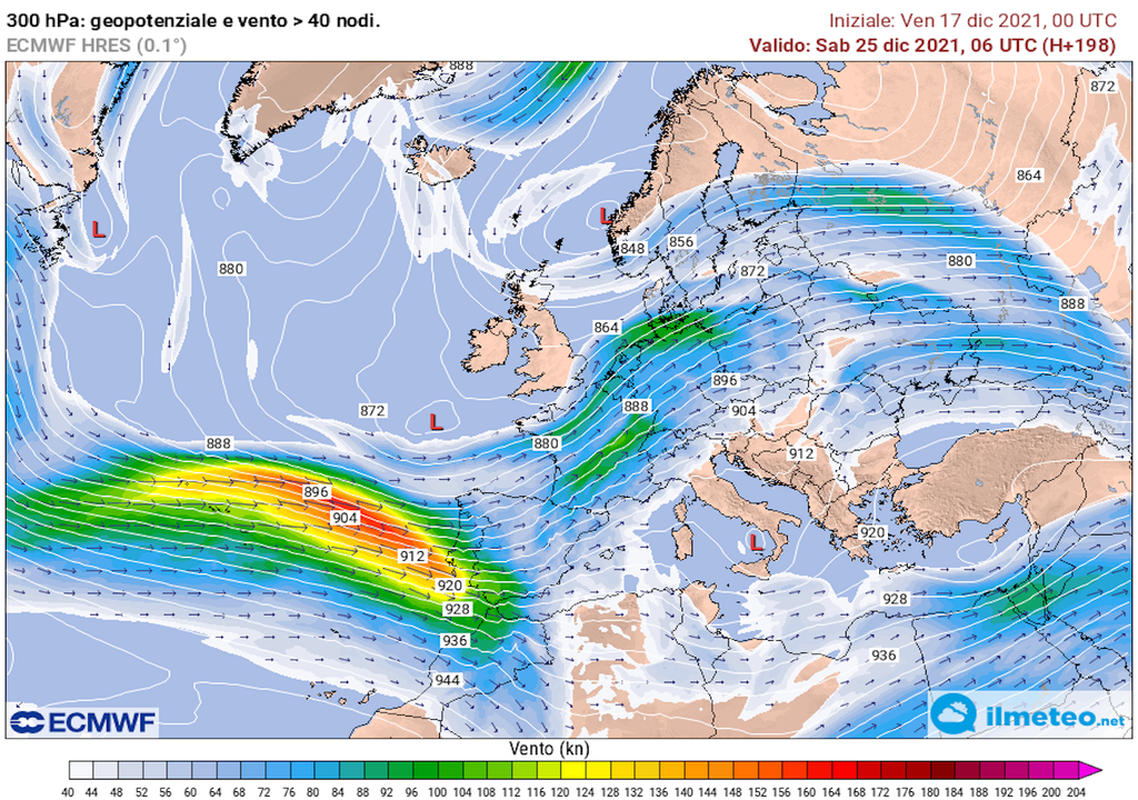 L’anticiclone ora ha il massimo sul Regno Unito con 1040 hPa, e si estende appunto a tutta l’Europa centro-occidentale e al Bacino del Mediterraneo. Nelle prossime 48-72 ore si strutturerà in senso meridiano, col massimo che migra fra Islanda e Scandinavia. Sul suo fianco orientale troveremo così la corrente a getto polare, che porterà fronti freddi verso i Balcani, lambendo le nostre regioni meridionali adriatiche. Nella settimana di Natale il cedimento dell’anticiclone avverrà non a opera delle correnti gelide artiche, ma di flussi atlantici umidi e miti. Insomma, sfumano le speranze di un bianco Natale.