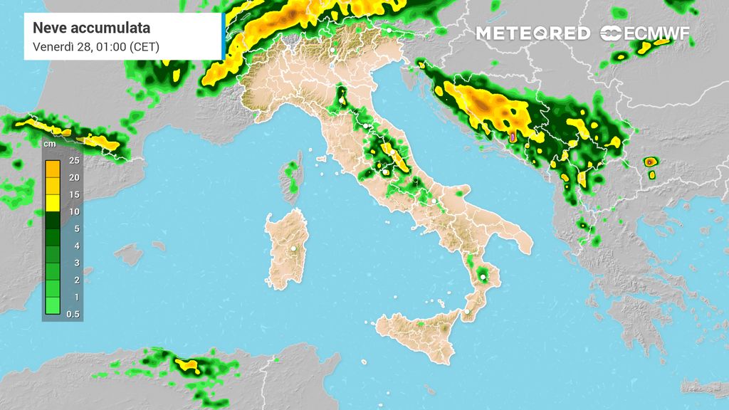Tra mercoledì 26 e giovedì 27, l'attenzione massima va ai rilievi di Marche, Umbria orientale, Lazio interno e Abruzzo. Qui la neve, con lo zero termico in calo, potrà spingersi fin verso i 600 metri, imbiancando i rilievi del Reatino, in primis il Monte Terminillo e poi i Monti Sibillini, tra Marche e Umbria. Una nevicata suggestiva è attesa anche nella Piana di Castelluccio di Norcia già dalla serata.