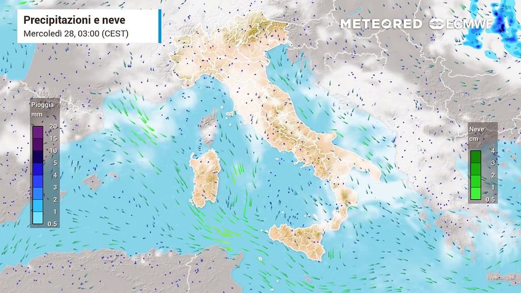 Nella notte e domani mattina piogge e temporali dal Nord-Est si muoveranno verso sud, andando ad interessare dapprima Marche, poi Abruzzo, Molise e zone interne di Lazio e Campania, Basilicata e Puglia, per arrivare in tarda mattinata sulla Calabria settentrionale e centrale ed esaurirsi qui nuovamente entro sera.