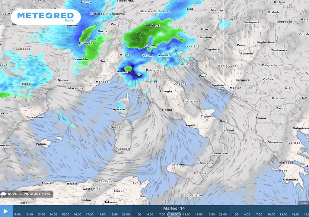 Lunedì giornata ancora variabile con nubi in aumento al nord e centro. Focus su martedì giornata in cui transita un fronte freddo, piuttosto veloce nel suo passaggio ma per un po’ anche il nordovest si illuderà vedendo la neve estendersi sulle Alpi e qualche pioggia in pianura, poi nel pomeriggio il tutto si sposta al nordest, dove i fenomeni risulteranno più organizzati.