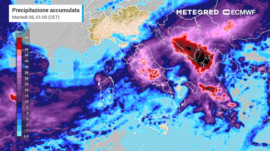 Secondo il modello ECMWF, di riferimento per Meteored Italia, potranno accumularsi in città fino a 13 mm di pioggia.