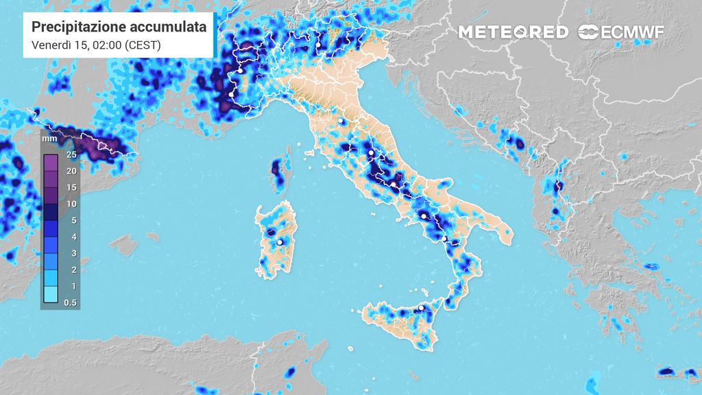 Secondo le previsioni e il modello di riferimento di Meteored, la probabilità di temporali crescerà a partire dalle 14, in particolare lungo l’arco alpino e sull’Appennino centrale, con fenomeni che localmente potranno essere intensi e accompagnati da grandine di grosse dimensioni.