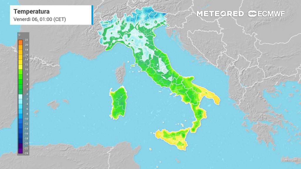 La nuova settimana inizia con un sensibile calo delle temperature minime che si porteranno decisamente al di sotto della media del periodo con le possibili gelate anche in pianura al Nord e nelle conche interne del centro.