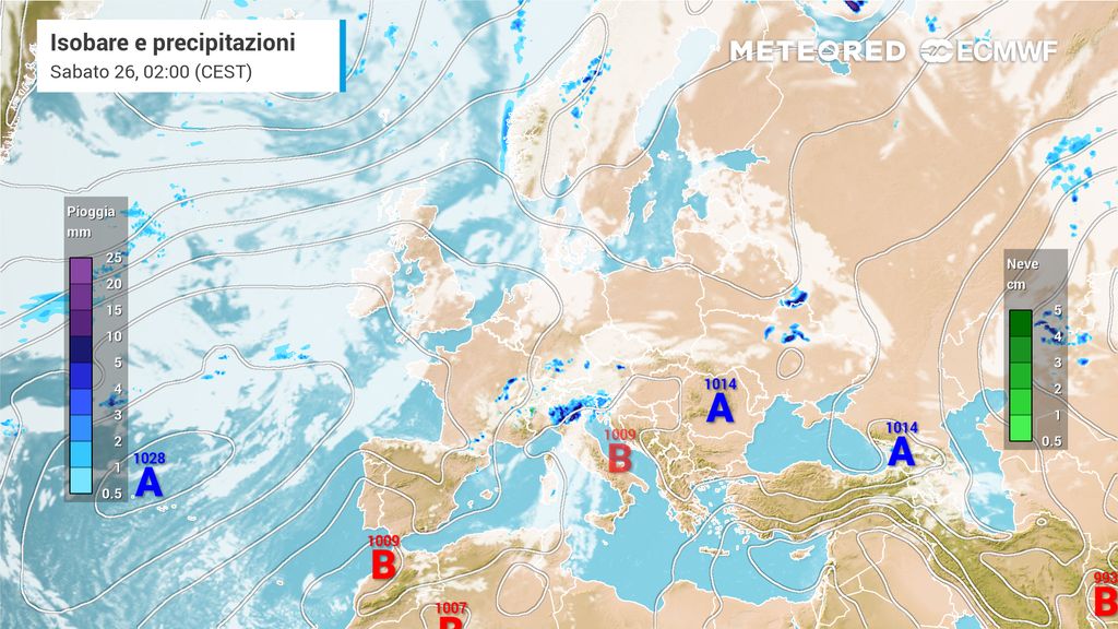 La discesa di aria fredda darà luogo a rovesci temporaleschi nell’area cantabrica e a temporali forti o molto forti nel nord-est della Penisola. I temporali inizieranno a scaricare con intensità sull’area pirenaica, estendendosi nel corso della giornata su gran parte della Catalogna e del nord della Comunità Valenciana. Si prevedono rovesci di pioggia forti o molto forti, localmente con intensità torrenziale e grandinate, con la possibilità che alcune cellule temporalesche scarichino grandine di grosse dimensioni.