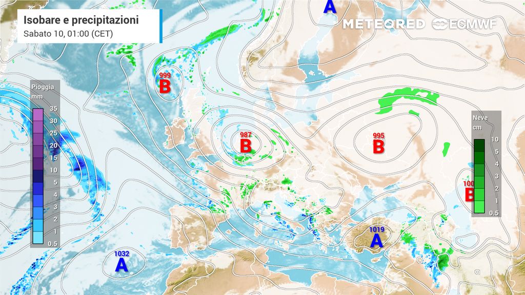 La perturbazione atlantica e invernale interagirà con una massa d’aria molto fredda attualmente presente sul Regno Unito e in alcune zone dell’Europa occidentale, portando nevicate significative, anche in aree già innevate come la Francia.