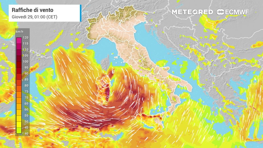 Già nel corso della mattinata di giovedì 29, l’intensa ventilazione nord-occidentale, in uscita da Carcassonne e dal Golfo del Leone, dopo aver sferzato la Sardegna, si propagherà fino al Canale di Sicilia e al medio-basso Tirreno, con forti venti da ovest-nord/ovest e nord/ovest che potranno superare i 70-80 km/h sulle coste della Sicilia tirrenica, e dalla tarda serata pure sulla Calabria tirrenica.
