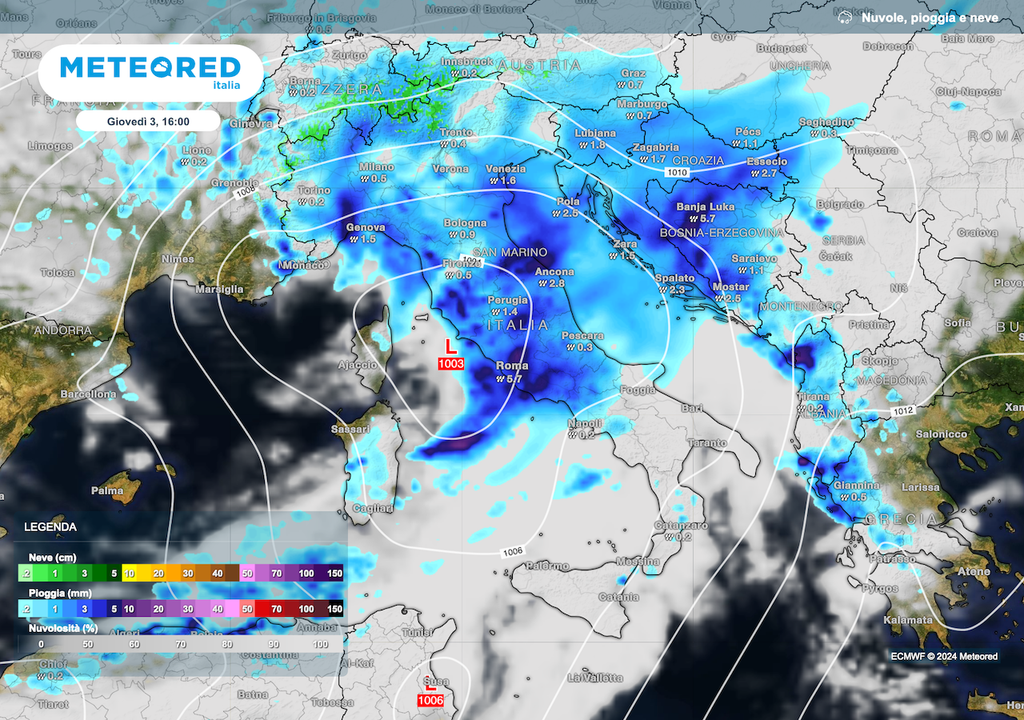 Nel dettaglio, il fronte freddo sopra citato e il flusso di acqua precipitabile del fiume atmosferico, uniti all’effetto di una saccatura in quota, indurranno alla formazione di una depressione sull’Italia centrale.
