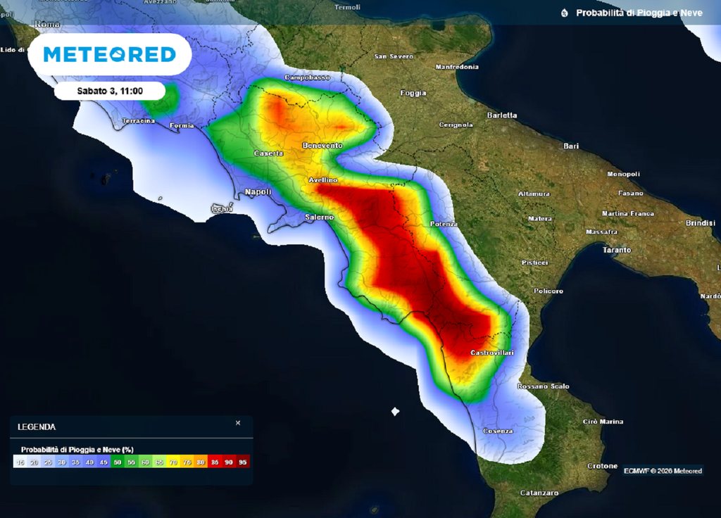 L’ingresso di aria più fredda favorirà piogge diffuse sulle regioni centro-meridionali e un generale calo delle temperature. La neve potrà spingersi fino a quote collinari sull’Appennino centrale, con possibili accumuli significativi, mentre sul Nordest non si esclude il ritorno di nevicate fino a quote molto basse.