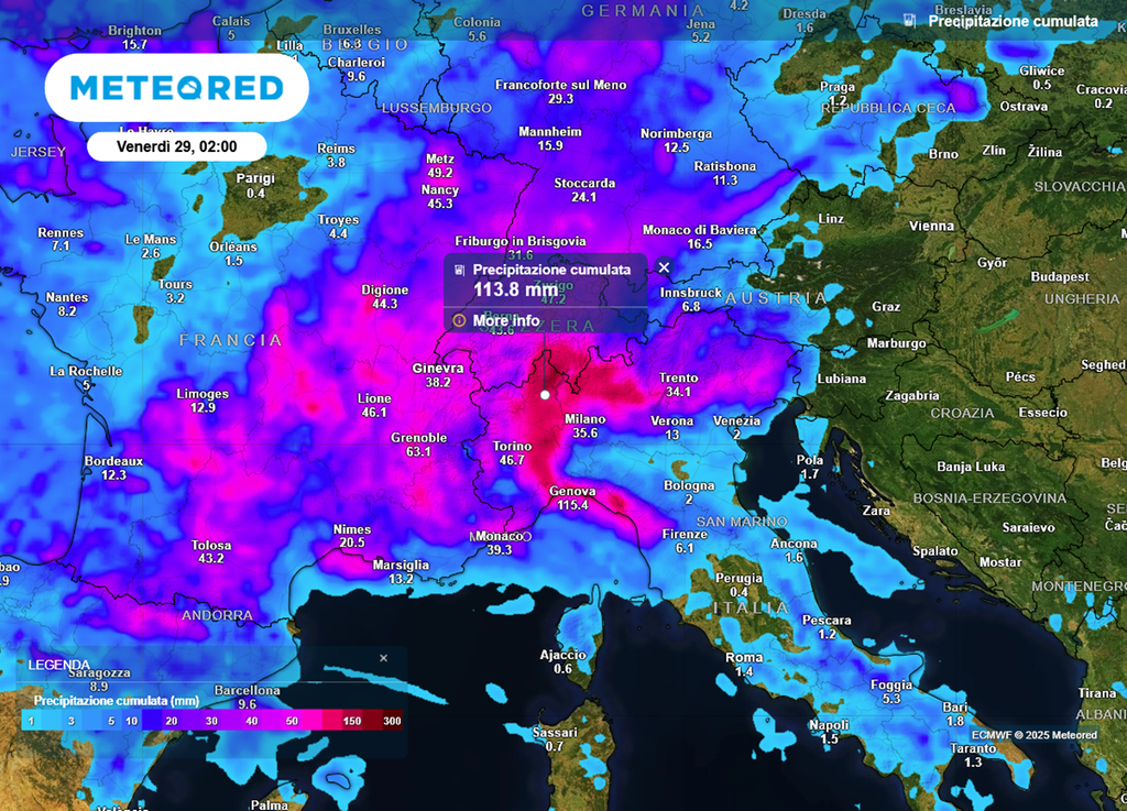 Attenzione perché il modello europeo ECMWF, di riferimento per tutte le previsioni di Meteored, indica possibilità di oltre 100 mm di accumulo pluviometrico in poche ore, nella sola giornata di giovedì, in vaste zone del Piemonte, ma anche in parte della Liguria e della Lombardia.