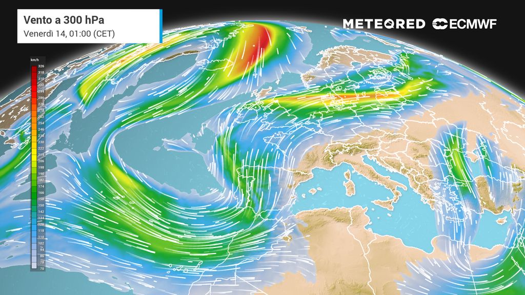 In questa fase il ramo principale del “getto polare” raggiunge le massime intensità, risultando molto ben stirato lungo l’intero emisfero.