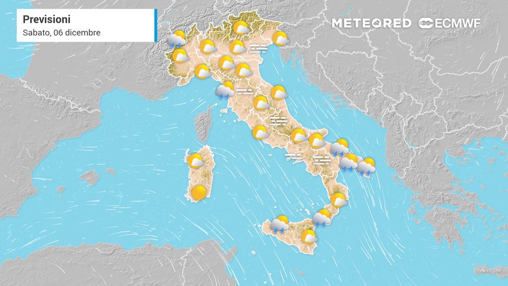 Nella giornata di sabato 6 dicembre la depressione responsabile del maltempo si allontanerà verso la Grecia e il Mar Egeo. Questo spostamento permetterà all’Italia di beneficiare di una graduale rimonta dell’alta pressione, con un miglioramento netto soprattutto al Nord e sui versanti tirrenici.