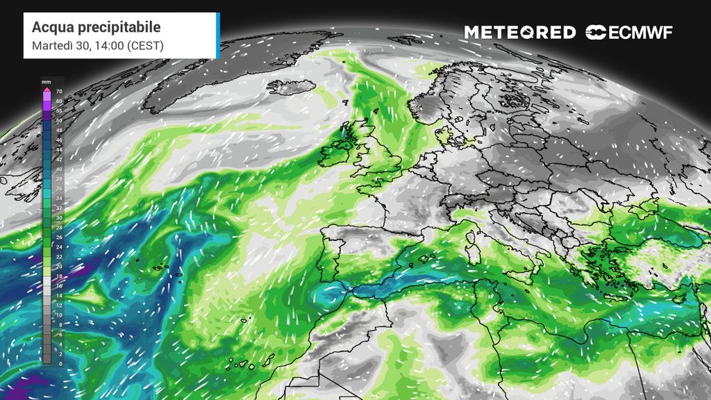 Secondo il nostro modello di riferimento, Estremadura e l’ovest dell’Andalusia saranno le regioni autonome spagnole più colpite dalle piogge. La depressione trascinerà aria subtropicale dall’Atlantico e nel cuore del sistema i valori di acqua precipitabile saranno molto alti, reminiscenze della sua origine tropicale. Alcuni scenari mostrano accumuli che potrebbero superare i 50 l/m² in queste aree tra domenica e lunedì.