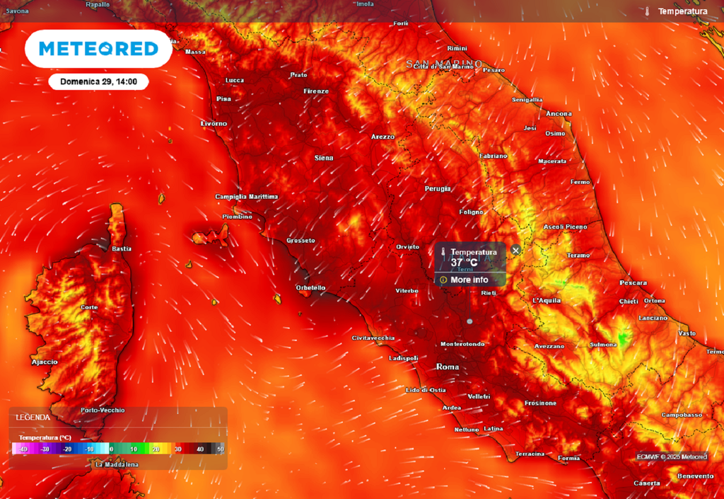 I valori più elevati si toccheranno nelle aree interne di Campania, Lazio, Umbria, Toscana e Sardegna, dove si potranno registrare picchi compresi tra i 37 e i 40 °C.