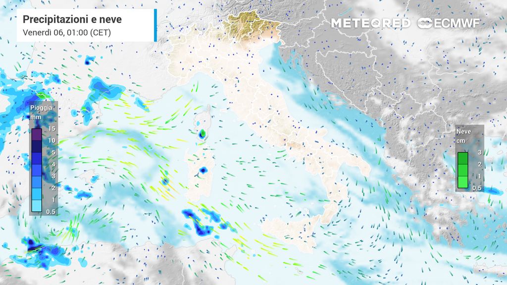Da domani poi a queste nubi si aggiungeranno anche precipitazioni più estese che interesseranno dapprima la Sardegna per poi raggiungere anche le regioni centrali tirreniche, in particolare il Lazio e la Toscana.