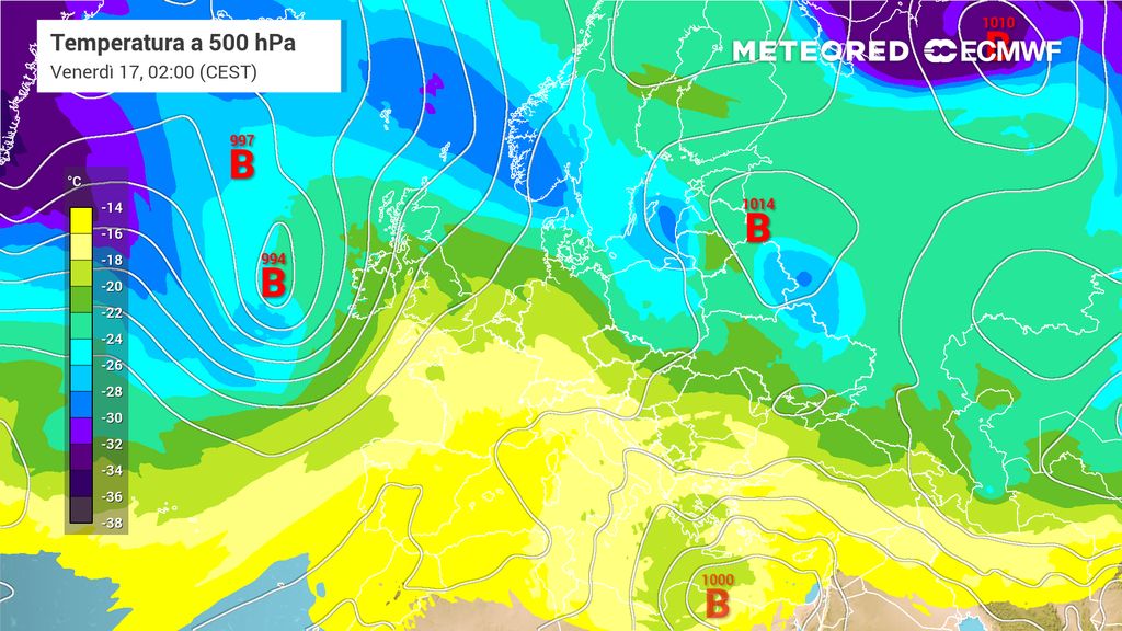Nella parte finale della settimana si tornerà nuovamente ad avere un cambiamento nella distribuzione delle anomalie, con un aumento dei valori di geopotenziale proprio in corrispondenza dell’area Scandinava.