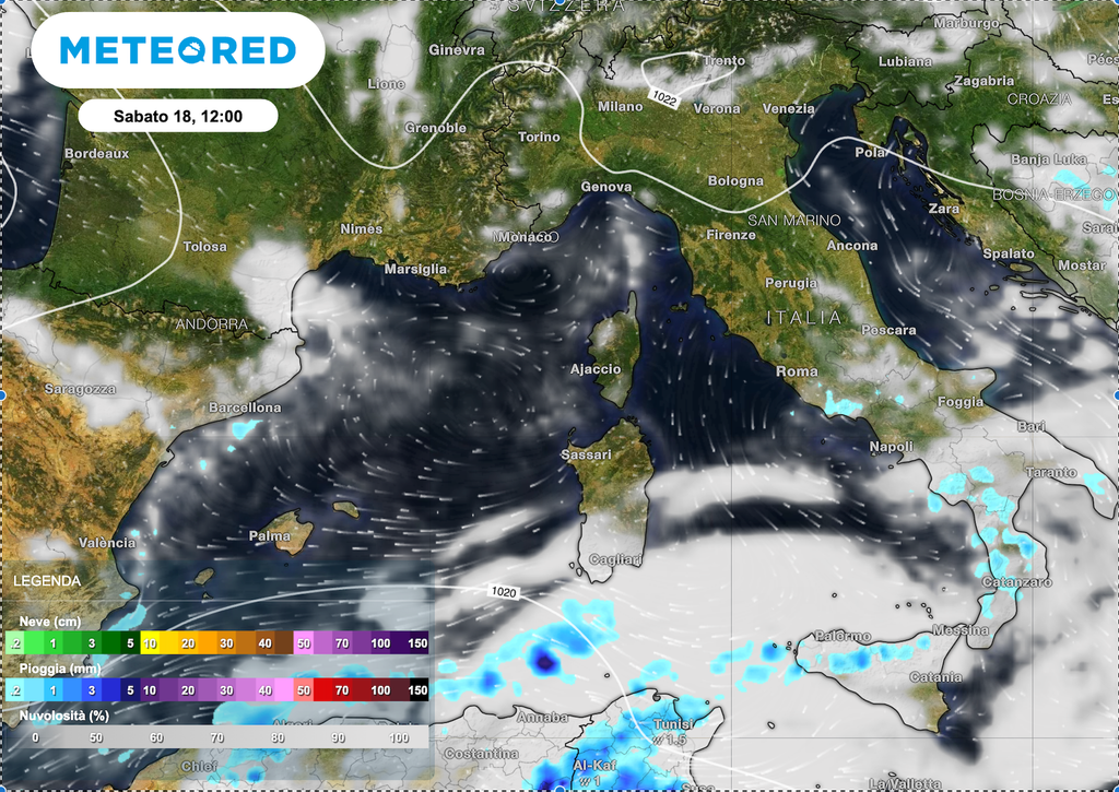 Le precipitazioni tenderanno ad attenuarsi entro sera, lasciando spazio a schiarite via via più ampie. Le temperature al Sud si manterranno leggermente inferiori rispetto al resto del Paese, con valori massimi compresi tra 18 e 20 °C e venti moderati di Maestrale che contribuiranno a rendere l’aria più fresca e tersa.