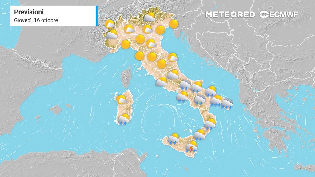 Le previsioni meteo per venerdì 17 ottobre sono caratterizzate da tempo incerto sulle regioni meridionali, dove persisteranno ancora residui fenomeni instabili: in particolare, tra Calabria e Sicilia orientale saranno possibili rovesci sparsi o locali temporali, soprattutto nelle ore centrali del giorno.