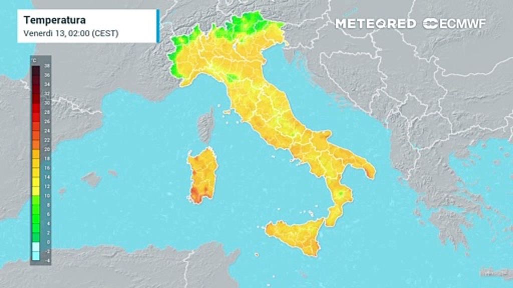 Per quanto riguarda le temperature, al nord, ci sarà un lieve calo con massime di 23-24°C nel nordovest e ancora 25-27°C nel nordest. Nel centro e nel sud, le temperature massime rimarranno intorno ai 30°C, con picchi fino a 33-34°C in Sicilia domenica. Inizio del calo termico sull'alto Veneto e Friuli Venezia Giulia con massime di 21-23°C. Minime dai 14-16°C del nord ai 18-20°C del sud
